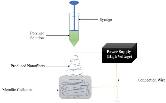 Nanofibers are wound dressing materials that possess an average diameter of fewer than 1000 nanometers [76]. The nanofiber wound dressings are easily removed from the wound after their application. Electrospinning is a commonly employed technique for the fabrication of nanofibers. It is relatively flexible, simple, and produces nanofibrous scaffolds closely resembling the natural extracellular matrix (ECM) in size, scale, and structure [77,78]. The setup of the electrospinning technique is shown in Figure 3. Many prepared nanofibrous structures have been reported to be biocompatible with many skin cell types. Two important advantages of electrospun nanofibrous scaffolds are their large available surface area, efficient functionalization, and the possibility of formulating them from a broad variety of natural and synthetic polymers [79,80]. Other benefits of electrospun nanofibers that can contribute to skin regeneration and wound healing applications include high porosity, small diameter, gas permeation, and narrow diameter distribution [81,82]. Some researchers have reported the pre-clinical outcomes of gellan gum-based nanofibers for the treatment of wounds.