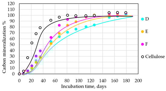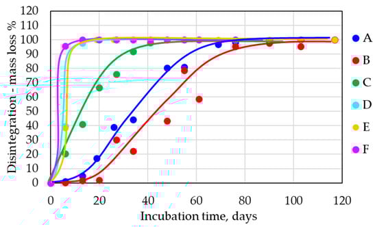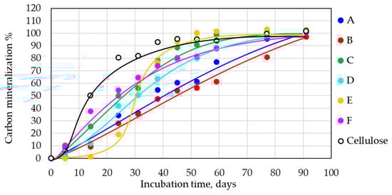 Film samples D, E, and F were selected for biodegradation under home-composting conditions (28 °C, Figure 4). From our previous experiences [28,29] and the majority of the scientific literature on the topic [30], it should be expected that the PLA fraction of the materials should not be mineralized under such conditions.
