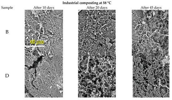 The selected samples were removed from the compost after incubation, and they were observed in SEM to evaluate microbial colonization and deterioration of the material’s surface (Figure 3). After only 10 days in the compost, all materials were densely colonized, and the density of the biofilm was clearly increased with the time of exposure. It was not possible to identify the microorganisms present, but the morphological appearance suggested filamentous thermophilic actinobacteria with distinguishable round endospores. The erosion of the surface was also clearly apparent.
