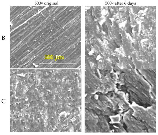 SEM images of the tested samples before composting and after 6 days of incubation in an electric composter. Specifications according to Table 2. (B—500 mL cup and C—200 mL cup with TPS).