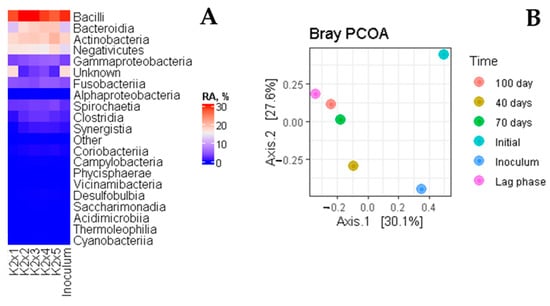 The bacterial community inside an electric composter. (A): heatmap at class taxonomic level, RA, relative abundance. (B): PCoA scatter plot.