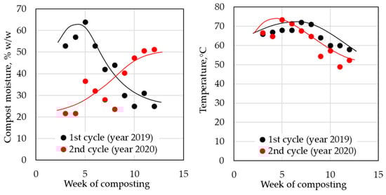 Moisture and temperature profiles during composting in a municipal composting plant.