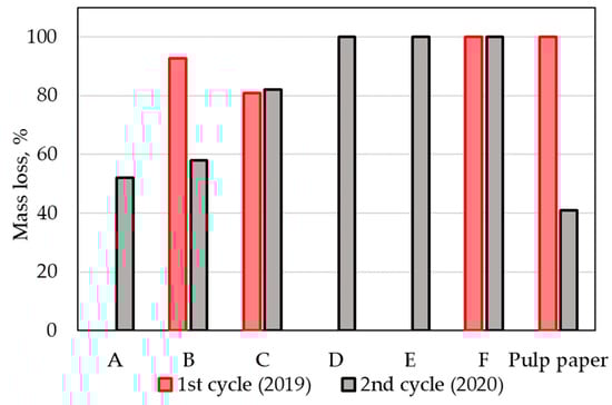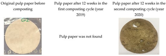 Significant differences in the first cycle (year 2019) were observed in the degradation of the pulp paper reference in both cycles (Figure 11 and Figure 12). While temperature profiles were very similar in both cycles, the trends of the compost substrate humidity differed significantly. The first stages of composting in the second cycle proceeded apparently at insufficient humidity, which could explain why in the second cycle, the compost was not sufficiently active for the biodegradation of the reference material. Suitable moisture content is an essential parameter for the composting process, especially during the initial hot phases of the composting. The pulp paper reference was not found in the first cycle of composting after 12 weeks, while in the second cycle, with low humidity in the first stages of composting, lower than 50% weight loss was observed (Figure 12), and the paper still preserved its original shape (Figure 11).