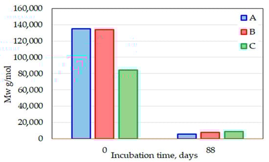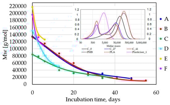 In the case of the electric composter, after each period, molecular weight distributions were measured by GPC. It must be noted that GPC measurements were realized with solid, nondegraded residuals of composted materials. GPC curves of unprocessed PLA and PHB used in the blends were also analyzed, and the records are shown (Figure 13, insert). Partial degradation due to blending and then processing of the blend during sample preparation was noticeable for each sample. The degradation caused by processing only in the melt state was not very extensive; only in the case of sample C was its extent more significant. This can relate to the presence of glycerol in TPS and possible alcoholysis of PHB by glycerol [31,32]. The intense shift of the main peaks to lower molecular weights after composting was visible mainly in the case of thick cup samples. In addition, the appearance of low-molecular-weight fractions was clearly seen in GPC records. The last indicated fraction produced by the biodegradation process exhibited an average molecular weight (MW) of about 1000 g/mol. Lower MW fractions (below 500 g/mol) were probably easily mineralized. The fast gradual decrease of MW was observed for all samples (Figure 14).