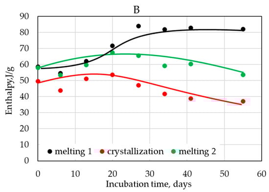 Evolution of enthalpies of melting and crystallization during the incubation in an electric composter for sample B.