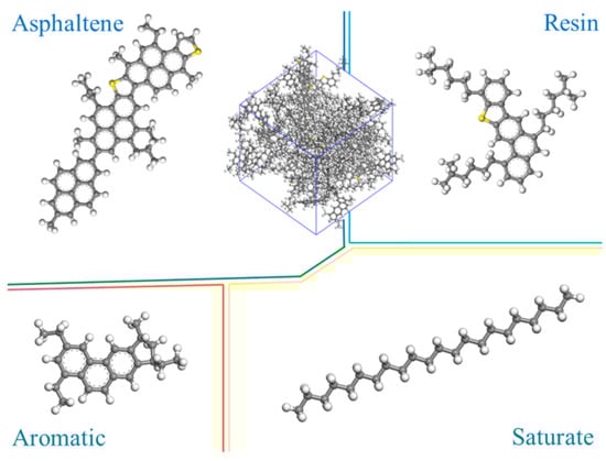 Molecular structure models of four asphalt components and matrix asphalt (carbon atoms are gray, sulfur atoms are yellow, and hydrogen atoms are white).