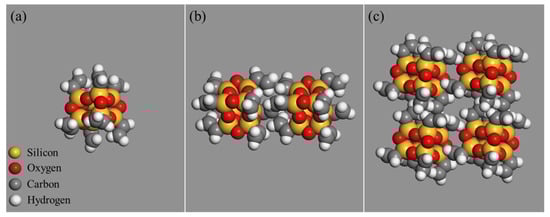Using the cluster building tool, nanoclusters with three different sphere diameters were built, that are 5 Å, 7 Å, and 9 Å. The sphere diameters of nanoclusters are referred to as the size of nanoclusters in this research. The parameters of OvPOSS are listed in Table 4. The constructed nano-OvPOSS nanoclusters with three kinds of diameters are shown in Figure 2.