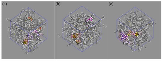 Nano-OvPOSS/SBS modified asphalt models with different nano-OvPOSS diameters: (a) 5 Å nano-OvPOSS; (b) 7 Å nano-OvPOSS; (c) 9 Å nano-OvPOSS.