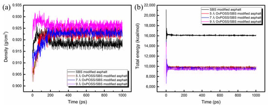 The accuracy of simulation models and methods can be verified through two important indicators—density and energy. Thus, these two indicators of SBS modified asphalt system and nano-OvPOSS/SBS modified asphalt systems were studied. Figure 7 shows the density and the energy of the four asphalt systems as a function of simulation time. The density and the energy of the four systems can be seen in this study to have reached the equilibrium state within 1000 ps. The dynamic results of the last 600 ps (400–1000 ps) were chosen as the data reference for subsequent calculation, during which time the density profile and the energy profile were able to reach a stable state. It can be seen that the separate addition of the three kinds of nano-OvPOSS increased the density of the SBS modified asphalt system and decreased the total energy of the SBS modified asphalt system.