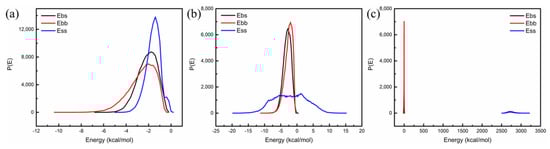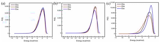 The probability distribution of mixing energy of nano-OvPOSS with SBS: (a) 5 Å nano-OvPOSS; (b) 7 Å nano-OvPOSS; (c) 9 Å nano-OvPOSS.