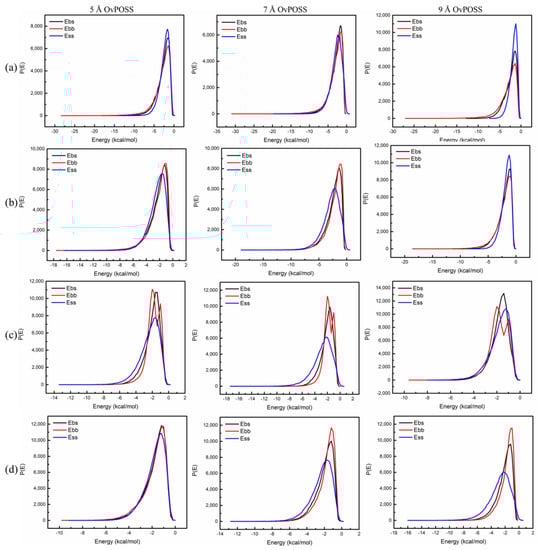 The asphalt blends were used as the screen and SBS as the base. Figure 11a shows the probability distribution of mixing energy of matrix asphalt/SBS without nano-OvPOSS; Figure 11b–d show the probability distribution of mixing energy of 5 Å nano-OvPOSS/asphalt/SBS, 7 Å nano-OvPOSS/asphalt/SBS, and 9 Å nano-OvPOSS/asphalt/SBS, respectively. As can be seen from Figure 11a, the probability distribution curves of Ebb, Ebs, and Ess of matrix asphalt/SBS are very similar to each other, which signifies that SBS has good compatibility with asphalt. The similarity of the curves of Ebb, Ebs, and Ess of 5 Å nano-OvPOSS/asphalt/SBS can also be found in Figure 11b. Such similarity indicates the compatibility between SBS and asphalt are not changed by the addition of nano-OvPOSS and 5 Å nano-OvPOSS/asphalt/SBS are compatible with each other. The same conclusion can also be drawn from Figure 11c that 7 Å nano-OvPOSS/asphalt/SBS are compatible with each other and from Figure 11d that 9 Å nano-OvPOSS/asphalt/SBS are compatible with each other.