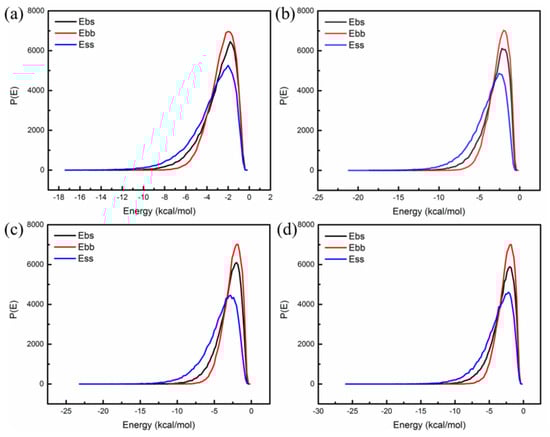 The probability distribution of mixing energy of SBS with asphalt blends: (a) matrix asphalt/SBS; (b) 5 Å nano-OvPOSS/asphalt/SBS; (c) 7 Å nano-OvPOSS/asphalt/SBS; (d) 9 Å nano-OvPOSS/asphalt/SBS.