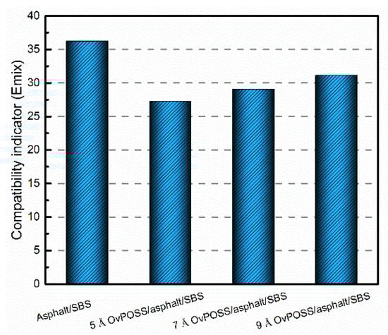 The quantitative analysis of the effect of nano-OvPOSS on the compatibility of SBS modified asphalt can be taken from Figure 12 which expresses the compatibility indicator Emix of modified asphalt. If the absolute value of Emix is the smallest, the compatibility of two materials is the best. It can be seen from Figure 12 that the absolute value of Emix of 5 Å nano-OvPOSS/asphalt/SBS is the lowest and that of SBS/asphalt is the highest. Moreover, as the particle size of nano-OvPOSS becomes larger, the absolute values of Emix of (5 Å, 7 Å, and 9 Å) nano-OvPOSS/SBS/asphalt increase sequentially. The results show that nano-OvPOSS is able to improve the compatibility between SBS and asphalt, thus easing off the phase separation and guaranteeing SBS modified asphalt a more stable state. Moreover, 5 Å nano-OvPOSS displays the best performance in improving the compatibility between SBS and asphalt.