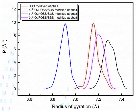 On the one hand, the SBS chain collapses in a crowded environment after the addition of nano-OvPOSS; on the other hand, the different shapes of the crowded particles bring out the different structures of SBS after the collapse [52], as is shown in Figure 14. Notably, the Rg peak width of SBS is narrowed to 0.31 Å, 0.26 Å, and 0.29 Å, respectively. The decrease of the peak width indicates that SBS branched chain reinforces its tractility and becomes easier to wrap the surrounding asphalt molecules after the addition of nano-OvPOSS, which promotes its attraction of the surrounding asphalt molecular [23].