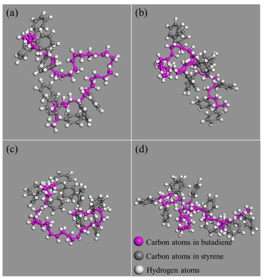 Rg is often used to characterize the dynamic trajectory of flexible systems for molecular systems. A small Rg indicates the polymer is relatively compact, meaning throughout its trajectory the polymer spends most of its time as a folded structure. Figure 13 and Figure 14 present respectively the changes of Rg and structures of SBS before and after the addition of nano-OvPOSS with different particle sizes into SBS modified asphalt. As is shown, without nano-OvPOSS, the Rg peak position of SBS is 7.28 Å and the width of Rg peak is 0.33 Å. With the separate addition of nano-OvPOSS with three different particle sizes, the Rg peak position of SBS shifts to 7.15 Å, 6.91 Å, and 7.20 Å. It reveals that the addition of nano-OvPOSS leads to the collapse of SBS molecule and increases the compactness of SBS. It is also notable that the 7 Å nano-OvPOSS has a more discernible effect on the compactness of SBS.