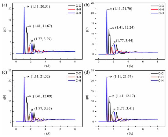RDF of atoms in four modified asphalt systems: (a) SBS modified asphalt; (b) 5 Å OvPOSS/SBS modified asphalt; (c) 7 Å OvPOSS/SBS modified asphalt; (d) 9 Å OvPOSS/SBS modified asphalt.