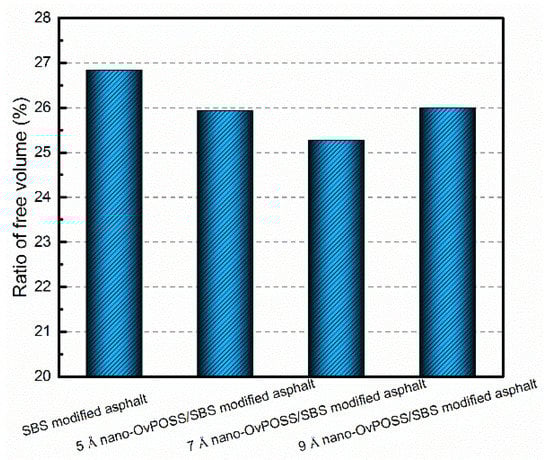 Free volume theory has been applied to predict the variation of viscosity and diffusivity of polymeric materials [53,54]. If the free volume fraction of asphalt reduces, its fluidity declines and thus its viscosity becomes higher, which in turn fortifies the deformation resistance of asphalt. Figure 16 describes the RFV of modified asphalt system in which the value of nano-OvPOSS/SBS modified asphalt of different nano-OvPOSS particle sizes (5 Å, 7 Å, and 9 Å) decreases by 3.39%, 5.85%, and 3.13% after the addition of nano-OvPOSS. This indicates that the free movement space of molecules in the modified asphalt system shrinks and the fluidity is hindered, so the addition of nano-OvPOSS increases the viscosity and enhances the deformation resistance of asphalt. This beneficial influence of nano-OvPOSS also derives from its unique structure of eight vinyl groups as an organic-inorganic nanohybrid material, because of which nano-OvPOSS reinforces its combination with molecules in asphalt system, boosts the non-bonding interactions between molecules, and then constructs a stable structural asphalt system. Notably, the 7 Å nano-OvPOSS performs better in reducing the RFV than 5 Å nano-OvPOSS and 9 Å nano-OvPOSS.