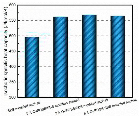 Heat capacity is defined as the amount of heat energy required to raise the temperature of a given quantity of matter by one degree Celsius. The larger the heat capacity, the more heat it absorbs. Therefore, the laws of thermodynamics are used to design new processes for reactions that would have high efficiency. In this study, the isochoric specific heat capacity (Cv) of modified asphalt systems was simulated at room temperature. The simulation results of Cv are shown in Figure 17. It can be seen that the results of the Cv of the three nano-OvPOSS/SBS modified asphalt systems are basically the same (because of the same addition content of nano-OvPOSS), and all are obviously higher than that of SBS modified asphalt. This simulation result shows that the nano-OvPOSS improves the Cv of SBS modified asphalt, which suggests nano-OvPOSS/SBS modified asphalt system has better temperature stability. That is to say, the addition of nano-OvPOSS is able to alleviate the thermodynamic instability of SBS modified asphalt, which is mainly because the inorganic body of nano-OvPOSS is capable of absorbing more heat.