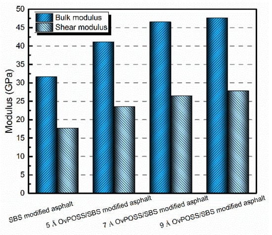The bulk modulus and shear modulus were simulated to investigate the effect of nano-OvPOSS on the mechanical properties of SBS modified asphalt. The results are shown in Figure 18. As can be seen, compared with SBS modified asphalt, the bulk modulus of nano-OvPOSS/SBS modified asphalt with different nano-OvPOSS particle size (5 Å, 7 Å, and 9 Å) increases by 30.15%, 47.11%, and 50.57%, respectively, and the shear modulus of these asphalt blends increases by 32.58%, 49.15%, and 57.11%, respectively. Thus, nano-OvPOSS has a positive effect on the two moduli of SBS modified asphalt. Such increment helps to equip asphalt with better mechanical properties and exceptional ability to resist deformation, thereby bringing out the desired performance in asphalt pavement. These simulation results are in agreement with laboratory test results [36]. In addition, the maximum values of bulk modulus and shear modulus of nano-OvPOSS/SBS modified asphalt are both obtained when the particle size of nano-OvPOSS is 9 Å. Therefore, the combination of 9 Å nano-OvPOSS and SBS in modifying asphalt is able to acquire the best deformation resistance ability of asphalt.