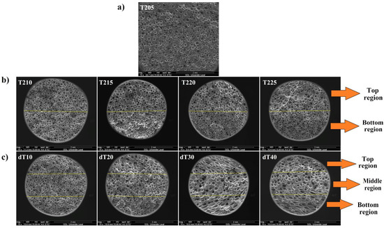 The cellular structure analysis of the first series indicated that increasing Tavg from 207.5 °C to 215 °C resulted in higher cell size in the top region (32%) and lower cell size in the bottom region (3%) combined with lower cell density in the top (56%) and bottom (3%) regions. On the other hand, increasing ΔT from 10 to 40 °C led to larger cell sizes (80%) in the middle region, as well as larger cell sizes in the top and bottom regions (175%).