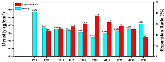 The foam density was obtained by a gas pycnometer (UltraPyc 1200e, Quantachrome, Boyton Beach, FL, USA) using 3 replicates. Equation (1) was used to calculate the foam expansion ratio where the density of the unfoamed POE is 0.874 g/cm3 [39]: