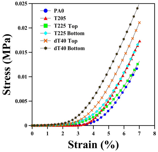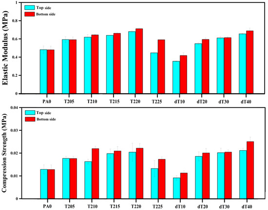 The compression test was carried out on both sides of each sample and the values with typical stress–strain curves (PA0, T205, T225 and dT40) are reported in Figure 3 and Figure 4, respectively. The results show that the compression elastic modulus and compressive strength (at 7% compression) increased by 15% and 16% (top side), but 20% and 26% on the other side (bottom side), respectively, at lower Tavg (205–212.5 °C). This is due to the higher Tavg leading to the production of more gas molecules inside the matrix. As each cell acts as an inflated balloon, the presence of more gas volume/pressure inside the cells improves their resistance against compressive forces [48]. In addition, foaming the POE led to higher compression properties. For instance, the elastic modulus increased from 0.482 to 0.593 MPa between PA0 and T205, respectively. However, both elastic modulus (34% top and 17% bottom side) and compressive strength (35% top and 22% bottom side) decreased at higher Tavg (212.5–215 °C). This behavior is directly related to morphological changes in Dn and ρcell (Table 2), as previously discussed [49]. As reported in Figure 3 and Figure 4, the bottom side of graded foams (having lower cell size and higher cell density) is more resistant to compression force. For example, the bottom side of T225 has higher elastic modulus (33%) and compression strength (31%) compared to its top side.