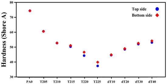 Similar to the first series’ trend, the elastic modulus and compressive strength of the second series increased by 85% and 131% (top side), as well as 65% and 121% (bottom side) from dT10 to dT40, respectively (Figure 3 and Figure 4). According to SEM images (Figure 1c), increasing ΔT led to the formation of three regions (top, middle and bottom), where the presence of these three regions plays a significant role in resisting against compressive loads. The presence of elliptical cells with large cell sizes (high volume of gas), at the top and bottom regions, prevents the sample from being compressed. Furthermore, the middle region, with homogenous and smaller cells, helps the sample to improve its resistance against compressive loads [50]. Finally, the hardness of the foams increased by 20% by increasing the ΔT from 10 to 40 °C (Figure 5). The highest hardness difference between both sides of a sample was obtained for dT40. Again, here, the results clearly showed that a graded morphology led to asymmetric mechanical properties. In our case, the maximum difference was 45% for the compression strength of dT20.