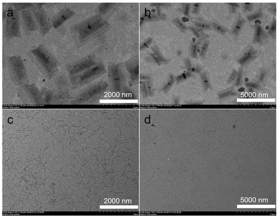 The TEM images of the nanostructures self-assembled by P3HT22-b-PEG43 (a,b) and P3HT22-b-PEG113 (c,d) in i-PrOH with the polymer concentration at c = 0.005 mg.mL−1.