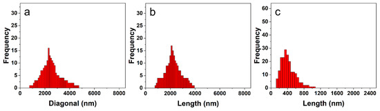 The size distributions of the nanostructures self-assembled by P3HT22-b-PEG43 (a,b) and P3HT22-b-PEG113 (c) in i-PrOH with the polymer concentration at c = 0.005 mg.mL−1. (a) The diagonal length distribution of the multilayered hierarchical micelles. (b) The length distribution of the 2D laminar layers included in multilayered hierarchical micelles. (c) The contour length of the fibers.