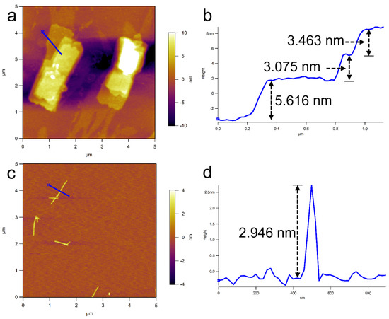 AFM images of the nanostructures self-assembled by P3HT22-b-PEG43 (a,b) and P3HT22-b-PEG113 (c,d) in i-PrOH with the polymer concentration at c = 0.005 mg.mL−1, the arrows represent the heights of each laminar layer or the single fiber.