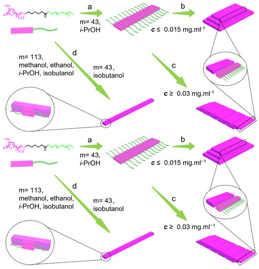 The probable formation processes of the nanostructures self-assembled by P3HT22-b-PEGm, (a) the transition fibers formed by P3HT22-b-PEG43 in i-PrOH during the cooling process, (b) the multilayered hierarchical micelles formed by P3HT22-b-PEG43 in i-PrOH when the polymer concentration is beblow 0.015 mg.mL−1, (c) the hierarchical micelles with linearly arranged 2D laminar layers formed by P3HT22-b-PEG43 in i-PrOH when the polymer concentration is above 0.03 mg.mL−1, (d) the fibers formed by P3HT22-b-PEG43 in isobutanol, or the fibers formed by P3HT22-b-PEG113 in methanol, ethanol, i-PrOH and isobutanol.
