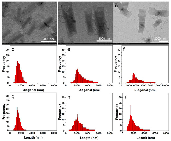 The TEM images and size distributions of the nanostructures self-assembled by P3HT22-b-PEG43 in i-PrOH with different polymer concentrations. TEM images of the multilayered hierarchical micelles in solutions at c = 0.001 mg.mL−1 (a), c = 0.015 mg.mL−1 (b), and c = 0.03 mg.mL−1 (c). The diagonal length distributions of the multilayered hierarchical micelles in solutions at c = 0.001 mg.mL−1 (d), c = 0.015 mg.mL−1 (e), and c = 0.03 mg.mL−1 (f). The length distributions of the 2D laminar layers included in multilayered hierarchical micelles in solutions at c = 0.001 mg.mL−1 (g), c = 0.015 mg.mL−1 (h), and c = 0.03 mg.mL−1 (i).
