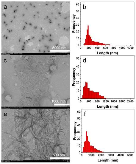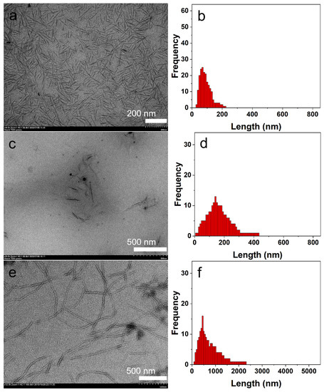 The TEM images and size distributions of the fibers self-assembled by P3HT22-b-PEG113 in different solvents at c = 0.015 mg.mL−1. The TEM images of the fibers in methanol (a), ethanol (c), and isobutanol (e). The length distributions of the fibers in methanol (b), ethanol (d), and isobutanol (f).