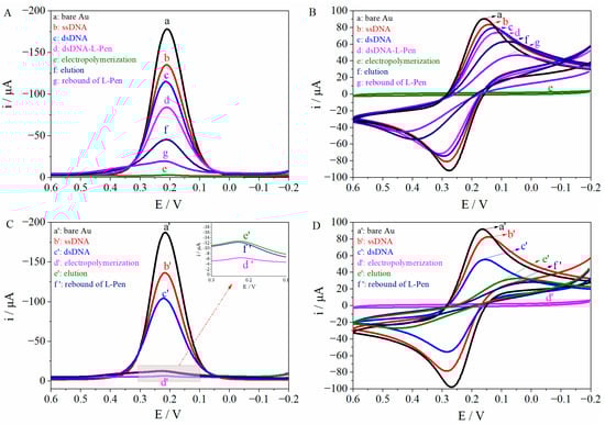 The properties of MIP/dsDNA in different processes were studied using DPV and CV. As shown in Figure 1A, curve a represents the bare Au electrode; when the electrode was modified by the self-assembly of ssDNA (curve b), hybridization (curve c), and embedding (curve d), the current intensity gradually decreased because the modification element impeded electron transport. After electropolymerization, a dense and weakly conductive MIP/dsDNA film was formed on the surface of the electrode, which significantly hindered the transfer of electrons and caused the current intensity of the probe to decrease sharply (curve e). A mixed solution of methanol-acetic acid (v/v, 8/1) was used to elute L-Pen from the polymer for 20 min, forming the corresponding conformational cavities, and the current intensity of the probe rebounded (curve f). Then, when the sensor was placed in a 5.0 × 10−14 mol/L L-Pen solution for 16 min, the size, structure, and recognition sites of the L-Pen-imprinted MIP/dsDNA cavities were stably filled again. This resulted in the blockage of electron transfer channels, and the peak current decreased (curve g). Therefore, quantitative analysis of L-Pen was successfully performed. The results were consistent with those obtained by CV (Figure 1B), further supporting the successful fabrication of the MIP/dsDNA sensor capable of L-Pen recognition.