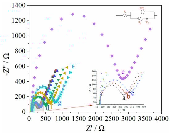 EIS was used to evaluate the electrode modification process in a 0.005 mol/L K4[Fe(CN)6]/K3[Fe(CN)6] solution as probe, as shown in Figure 2. The processes of self-assembly (b, 201.1 Ω) and hybridization (c, 229.2 Ω) were sequentially performed on the surface of bare Au electrode (a, 183.4 Ω), which promoted a gradual increase in resistance. When L-Pen was embedded with dsDNA structure, the corresponding resistance value increased again (d, 390.3 Ω). After electropolymerization, a dense and weakly conductive MIPs/dsDNA film severely impeded the probe transfer on the electrode surface, and the resistance value increased sharply (e, 2508.0 Ω). A methanol-acetic acid (v/v, 8/1) mixture was used to elute some L-Pen from the polymer for 20 min; the obtained imprinted cavities acted as transport channels of the probe, and the resistance value decreased (f, 492.2 Ω). When the MIP/dsDNA sensor rebounded with 5.0 × 10−14 mol/L mol/L L-Pen for 16 min, the L-Pen-imprinted cavities were stably filled again, thereby increasing the resistance again (g, 649.7 Ω). EIS curve fitting, carried out with ZsimpWin software, showed that the fitted curves of the equivalent circuit diagram R(C(RW)) were consistent with the measured curves under the same conditions.