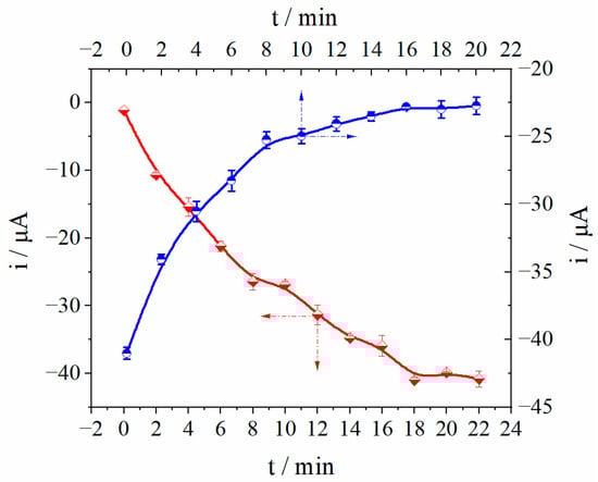 The performance of non-MIP/dsDNA under different process conditions was also studied using DPV, as shown in Figure 1C, where curve a’ represents the bare Au electrode. The current intensity of the probe gradually decreased from curve a’ to d’: this was attributed to the action of self-assembled dsDNA and non-MIP/dsDNA film, which gradually hindered electron transport on the electrode surface. As L-Pen was not present in the non-MIP/dsDNA, there were no imprinted cavities to recognize L-Pen after a 20 min elution (curve e’) with a mixed solution of methanol-acetic acid (v/v, 8/1; pH 8.0). Thus, the rebound signal of L-Pen (5.0 × 10−14 mol/L, 16 min) remained substantially unchanged (curve f’). These results, in agreement with the CV responses (Figure 1D), proved that the non-MIP/dsDNA sensor could not recognize L-Pen, eliminating the possibility of the physical adsorption of L-Pen to MIP/dsDNA