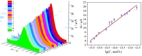 The DPV response of MIPs/dsDNA sensor to L-Pen on the 0.005 mol/L K4[Fe(CN)6]/K3[Fe(CN)6] (contain 0.1 mol/L KCl) and corresponding calibration curves (a~n: the concentration of L-Pen were 0, 3.0 × 10−16, 5.0 × 10−16, 7.0 × 10−16, 1.0 × 10−15, 3.0 × 10−15, 5.0 × 10−15, 7.0 × 10−15, 1.0 × 10−14, 3.0 × 10−14, 5.0 × 10−14, 7.0 × 10−14, 1.0 × 10−13, 3.0 × 10−13 mol/L L-Pen) (working potential from +0.6 V to −0.2 V. Error bar represents the standard deviation of three repetitive experiments).
