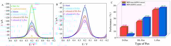 To evaluate the performance of the MIP/dsDNA sensor in the chiral recognition and separation of the Pen enantiomers, a MIP/non-dsDNA sensor was prepared for comparison. A 5.0 × 10−14 mol/L solution of Pen enantiomers was selected as the detection target, and the DPV signal of the sensor was recorded. The results are shown in Figure 5A, where the eluted signal (curve c) was used as a blank, and the MIP/non-dsDNA sensor rebounds were those for D-Pen (curve d), DL-Pen (curve e), and L-Pen (curve f). The probe response signal decreased gradually: the response to D-Pen decreased by approximately 13.45%, while that to DL-Pen decreased by approximately 22.08%, highlighting the sensor’s poorly selective recognition ability to distinguish and separate Pen enantiomers. In the MIP/dsDNA tests (Figure 5B), where the eluted signal (curve a’) was used as a blank, the sensor only had a distinct response to DL-Pen (curve b’) and L-Pen (curve c’), while the signal corresponding to D-Pen (curve d’) decreased by 2.26%, and that of DL-Pen decreased by 27.82%. The selectivity of this sensor to D-Pen was 6.4 times higher than that of the MIP/non-dsDNA one. This indicates that the fine structure of the imprinted recognition sites can be improved by introducing embedded dsDNA to immobilize the spatial conformation of the chiral molecule. This supports the possibility of improving the chiral recognition ability of the molecularly imprinted technology. The recognition performance of the MIP/dsDNA and MIP/non-dsDNA sensors for the Pen enantiomers is shown in Figure 5C.