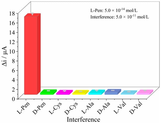 The current response of the sensor to the similar chiral substance of L-Pen (the concentration of L-Pen was 5.0 × 10−14 mol/L and the interference concentration was control as 5.0 × 10−11 mol/L).