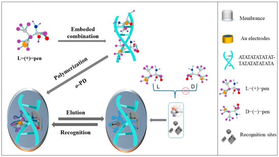 Penicillamine is a metabolite of penicillin with two enantiomers, D and L [17]. D-penicillamine (D-Pen) can treat Wilson’s disease and rheumatoid arthritis [18,19,20], and it has been used as an antidote for poisoning from copper and lead, among others [21,22,23]. In contrast, studies have found that L-penicillamine (L-Pen) is toxic and can cause neuritis and marrow damage [24,25]. Currently, the methods for detection and isolation of penicillamine involve flow injection [26], chromatography [27,28,29], spectrometry [30,31,32], colorimetric method [33], and electrochemical method [34,35,36,37]. However, the electrochemical sensor is miniaturized and easy to prepare, which effectively avoids the defects such as complex sample preparation, long detection time and expensive chiral selector. Therefore, it is significantly to establish a simple and highly selective electrochemical method for the detection of L-Pen. Here, we propose the use of optimized dsDNA as a chiral recognition element to induce chiral conformation and introduce it into MIPs: these are endowed with a triple-recognition ability through dsDNA-induced immobilized conformation, functional groups for base-assisted recognition, and recognition cavities formed by dsDNA-target molecule complexes. As shown in Scheme 1, the selected dsDNA was self-assembled on the surface of an Au electrode; then, L-Pen was inserted in the dsDNA for the subsequent electropolymerization to obtain L-Pen cavities of a highly specific conformation; finally, electrochemical methods were used to assess the sensor performance.