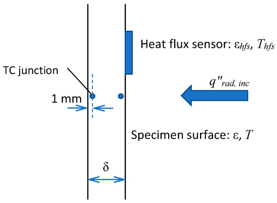 where the subscript “hfs” indicates the exposed surface of the heat flux sensor. We assume that the surface incident radiation is the same at the exposed surfaces of both the sensor and the specimen. However, the net heat fluxes at these surfaces are different because of the different surface temperatures and emissivities. The net heat flux at the exposed specimen surface is: