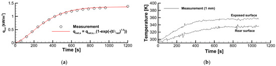 To evaluate the surface incident radiation (coming from the radiative panel) and the sample surface emissivity, we used the measurement data obtained in a one-side sample heating with no ignition. As shown in Figure 2, the vertically positioned sample was exposed to the radiative flux, and the outputs of two thermocouples (type K, junctions are located at the distance of δTC = 1 mm from the surface) and of the heat flux sensor (gSKIN® Heat Flux Sensor) were recorded for 20 min after the radiative panel was activated. The measurement results are presented in Figure 3, wherein the net heat flux recorded by the sensor is shown in Figure 3a, and the thermocouple readings at the exposed and rear surfaces are provided in Figure 3b.