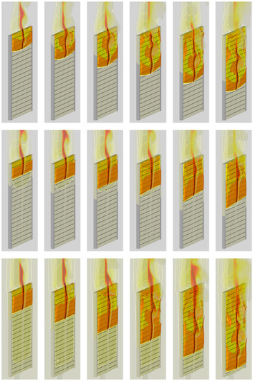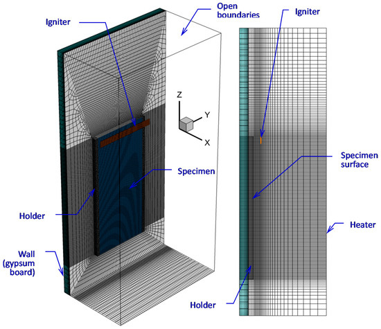 Ignition (by pilot burner flame in the experiment) was modeled by the radiative flux produced by the hot black strip (9.9 cm wide, 1 cm high) located at a distance of 1 cm away from the exposed specimen surface, with the upper edge of the igniter being at the same elevation as the upper edge of the specimen (see Figure 4). The igniter temperature was set 1200 K for 4 s, and this boundary condition was switched to the condition of zero heat flux afterwards. A zero-stress boundary condition was set for velocity at the igniter surface. The simulations have shown that the presence of the igniter did not significantly affect the flow after ignition, particularly after the flame front moved away.