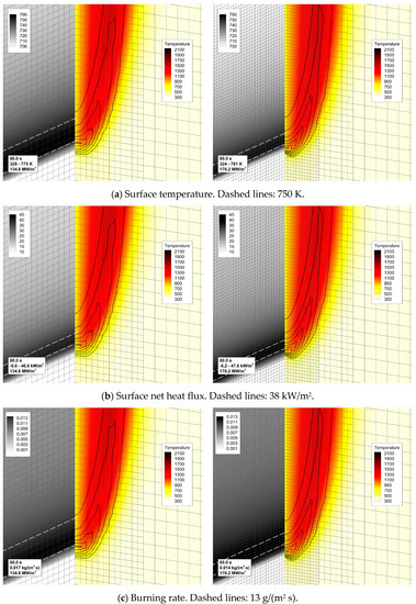 The effect of mesh refinement on flame structure and sample surface distributions near the edge of propagating flame. Distributions of (a) temperature, (b) net heat flux, and (c) volatile emission rate per unit area (burning rate) over the sample surface are shown along with the distributions of gas temperature (color) and volumetric heat release rate (lines) in the vertical plane containing the sample centerline. Left—mesh 2, right—mesh 3.