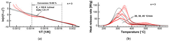 Determination of kinetic parameters in accordance with Equation (11) for the pre-assumed reaction order (a) and comparison of measured (solid lines with error bars) and simulated (solid lines, no error bars) dependencies at three heating rates (b).