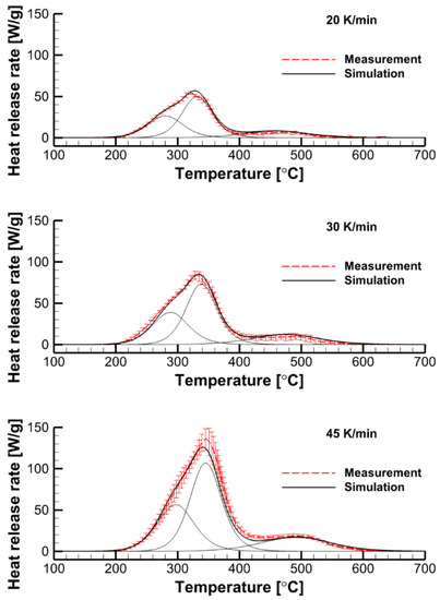 The formal kinetic model does not consider the detailed chemistry of polymer pyrolysis but aims at replicating thermal decomposition of the material at microscale. To obtain the reference data, microscale combustion calorimetry (MCC) measurements were performed at three heating rates of 20, 30, and 45 K/min. The measurement results (averaged over several similar runs) are demonstrated in Figure 9b by solid lines with vertical bars showing the standard deviation of multiple tests. In this work, two formal kinetic models consisting of either the single global reaction or several independent reactions were derived and applied.