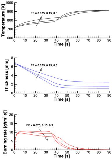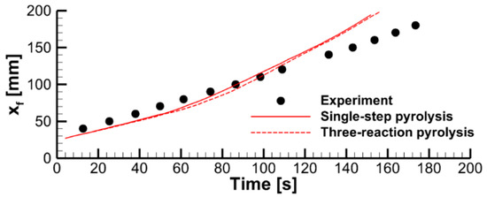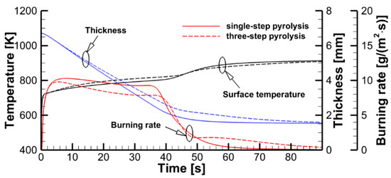 The effect of the pyrolysis model on sample decomposition is examined by performing the simulations using the pyrolysis model and prescribed heat fluxes at the sample surfaces. This comparison is presented in Figure 11, in which transient dependencies of predicted surface temperatures, current sample thicknesses, and volatile production rates are shown as simulated by the single-step global reaction model and by the three-reaction model described above. Although the selection of the kinetic model does affect the predictions, the overall effect appears to be moderate, and this effect weakens at a higher incident heat flux at the exposed sample surface. A weak sensitivity of the predictions to the accuracy of the kinetic model of the material decomposition highlights the governing role of the heat transfer from the exposed sample surface to the reaction zone. This conclusion, however, may fail near extinction, when the external heating is low, and the material decomposition kinetics becomes as important as the heat transfer to the reaction zone (see Ref. [15] for a simulation example).