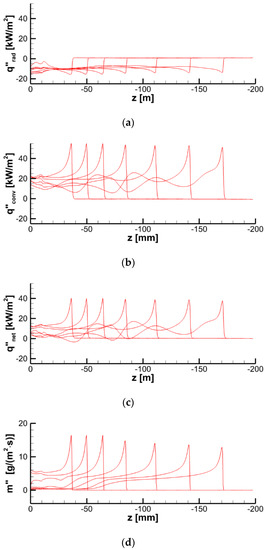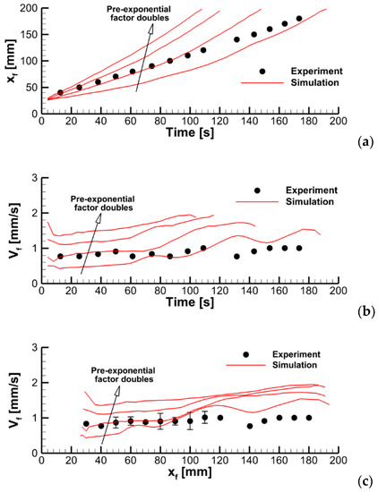 It is reasonable to expect that the velocity of the flame propagation should be controlled by the very onset of material decomposition and volatile emission. As such, for the pyrolysis reaction rate, = , we use = 3, = 122.6 kJ/mol, and = 2.84 × 109 s−1. Although this model does not match the shape of the measured curves, it does properly replicate the pyrolysis onset, peak reaction rates, and the pyrolysis temperature intervals observed in the MCC tests at different heating rates.
