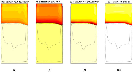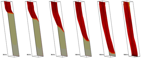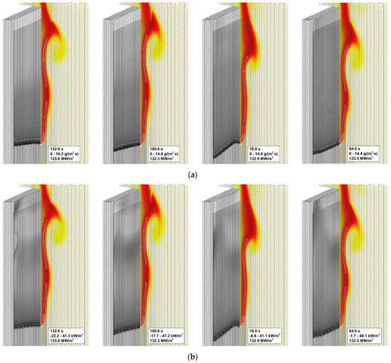 The predictions are not perfectly mesh-independent, and a certain increase of the predicted flame propagation velocity is still expected in case of further mesh refinement. However, in view of the drastically increased computational time, it was decided to proceed with the simulations made with the intermediate mesh (mesh 2 in Figure 5b). This decision is supported by the observation that, with this mesh, the experimentally observed flame propagation dynamics is reproduced reasonably well (see Figure 6). It was also found that the flow structure in the gas phase predicted with meshes 2 and 3 remains similar, as well as the distributions of temperature, heat fluxes, and volatile emission rate over the sample surface (Figure 7).