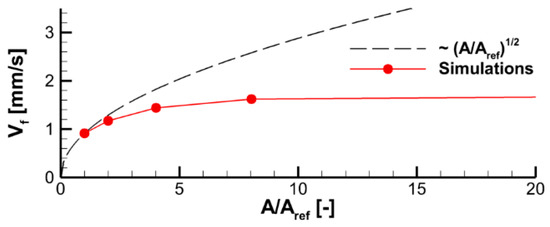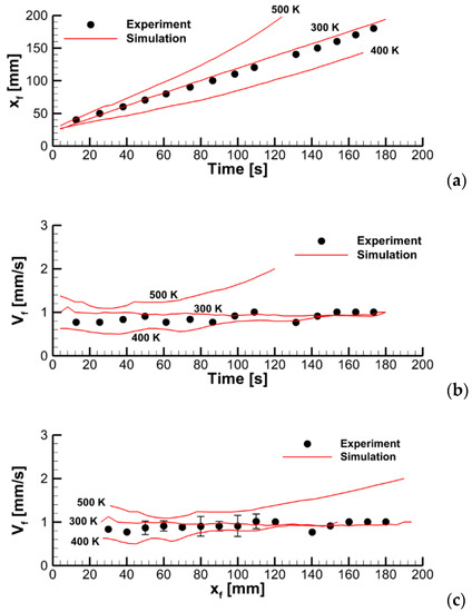 These estimates indicate that the effective temperature of the radiative panel assumed in the simulations should be selected to provide the surface incident radiation at the specimen surface to be close to 2 kW/m2. The specimen surface emissivity is more uncertain, and it may also vary as the specimen ignites and burns. As such, the specimen surface emissivity is the effective quantity that can be used to calibrate predictions against the measurements. Since the flame is optically thin, its radiative impact on the sample surface is low, and the surface emissivity of the burning specimen mainly affects the heat loss due to surface re-radiation. Therefore, a higher value of the surface emissivity would cause a reduced burning rate and, therefore, a lower flame propagation velocity. This has been confirmed in the numerical simulations. The simulation results presented in this work were obtained with = 0.9.
